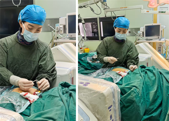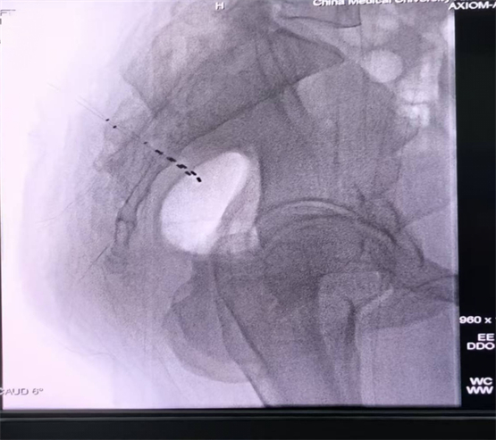 治疗分为两个阶段进行。团队首先为患者实施了一期双侧骶神经调控电极植入术。术中在DSA引导下将电极精准植入双侧S3神经孔,术中应答良好。术后随访显示,患者排尿功能得到改善,单次排尿量可达约200ml,尿动力学检查显示排尿期可见逼尿肌主动收缩。