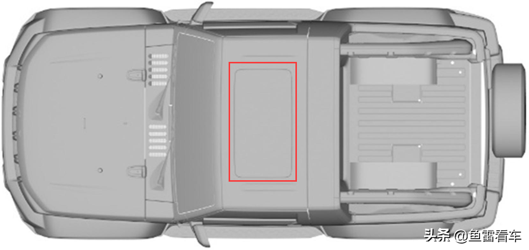 要说这申报图中未曾曝光的细节就属这车顶部分了,确实是真心没想到,竟然还带有天窗,当然指望内收式是奢望了,后端没有任何可供内收的空间余量了,不排除两种可能性,固定只能开启一道缝隙透口气亦或是外掀型,最好的结果是后者,但是要考虑到一个问题,似乎这车顶也是可拆卸的,如若是可拆卸的,那么天窗执行开启机构的重量就无法承担,特别是固定问题,不可拆卸的话一切问题迎刃而解,毕竟只是做个可拆卸的样子,表达一种设计思路;另外注意一个细节,货箱底部靠近备胎的位置,竟然出现了四个小圆洞,同时在前端也能看到两个更小的圆洞,难道这是为后排增加座椅而刻意开的预留口?