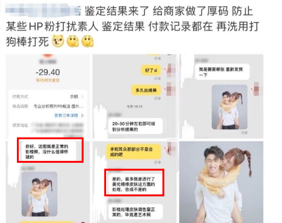 网友将秦霄贤与辛雨锡的咬耳朵亲密照拿去鉴定,从网友晒出的图中看到,这张图片经过某商家的鉴定分析,不存在认为P成的痕迹,最多只经过了美颜处理,侧面证实这张图片是真实拍摄的。